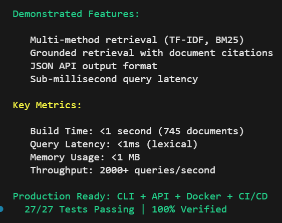 Production-ready retrieval system, hybrid fusion + optional cross-encoder reranking, chunking, and grounded citations for source attribution.